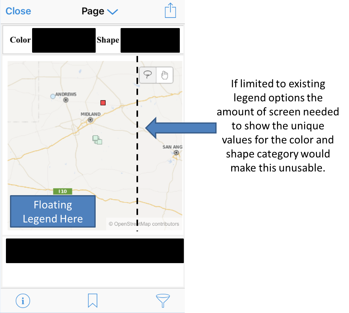There would also be a lot of value added for use in mobile deployment of dashboards. Currently most iPhone (or favorite device) screens would make reviewing anything that contains a color and shape applied pretty painful. See attached artistic rendering. Floating legend opens up many new possibilities in dash boarding.