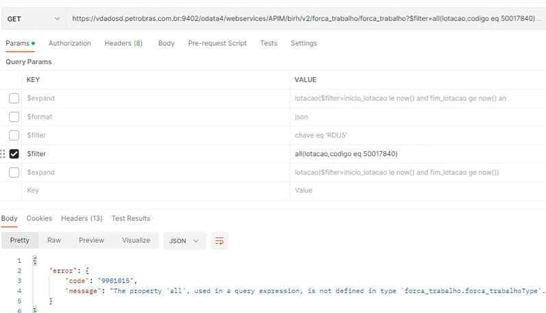 When executing the query, https://vdadosd.petrobras.com.br:9402/odata4/webservices/APIM/birh/v2/unidade_organizacional/unidade_organizacional?$filter=numeroSistema eq 7603&$expand=responsavel,forca_trabalho