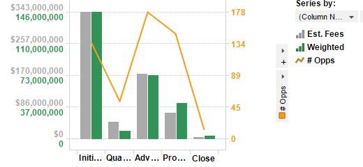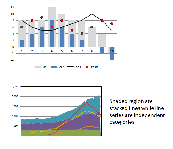 Allow for more robust combination charts. Multiple bar series, line series, stacked lines / area, markers, or any combination. Full color properties for stacked bars, individual line colors or marker colors based on categories or values in columns.