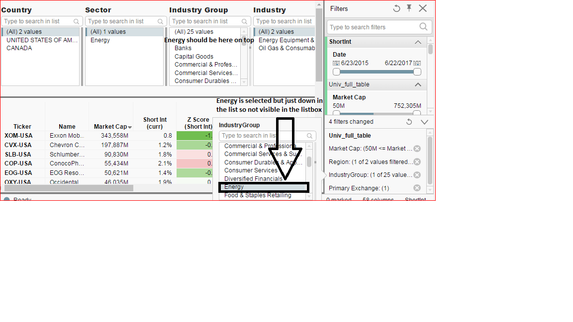 Listbox filter selections should migrate to top of list - see attached. It is often the case that listbox selections are not visible as the selected listbox filter is too far down the list.