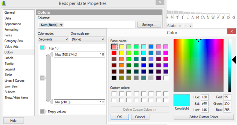 • Users have an inconsistent experience with the color picker for visualization color schemes (which at least shows the RGB value of the current selected color, as shown in TS-I-6184_(b).png - it shows the RGB values of the blue used for "Top 10" in the color scheme).