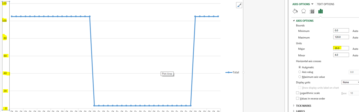 Choosing exact distance between marks on Y axis in line and bar chart Merged