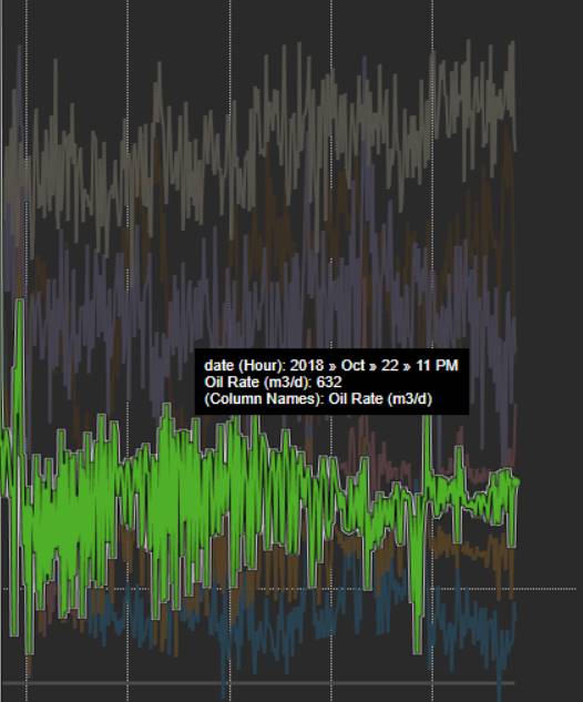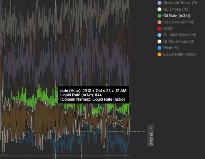 I have a number of columns on the Y-axis in a line chart, and I'm coloring by [(column Names)]. Noe I mark a single line in the color legend, and want to view information for each point on the marked line using tooltips.