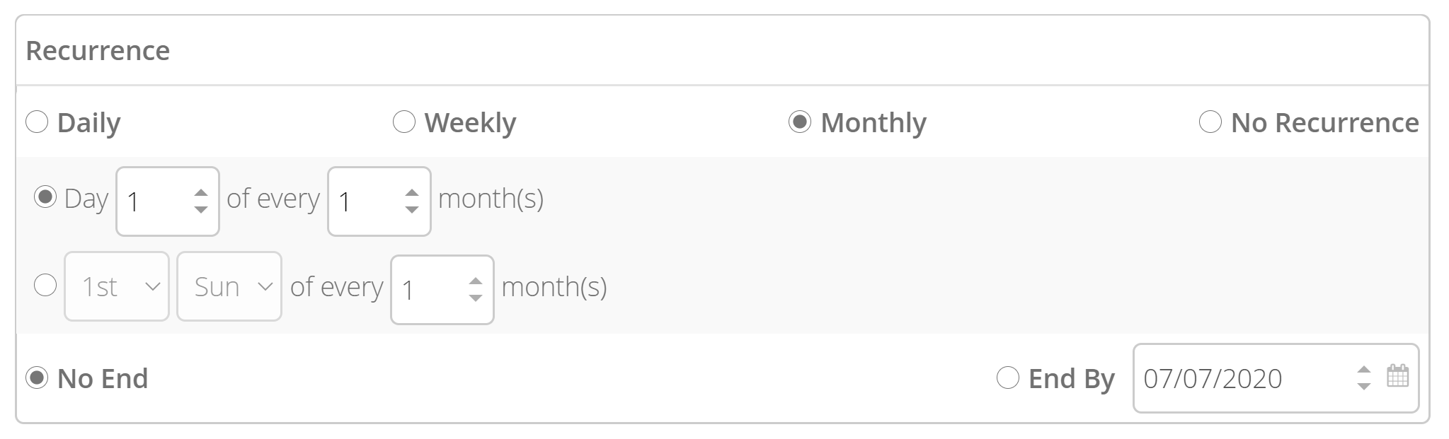 Need Month option and weekly option to select monthly first day or first week or monthly first weekday.