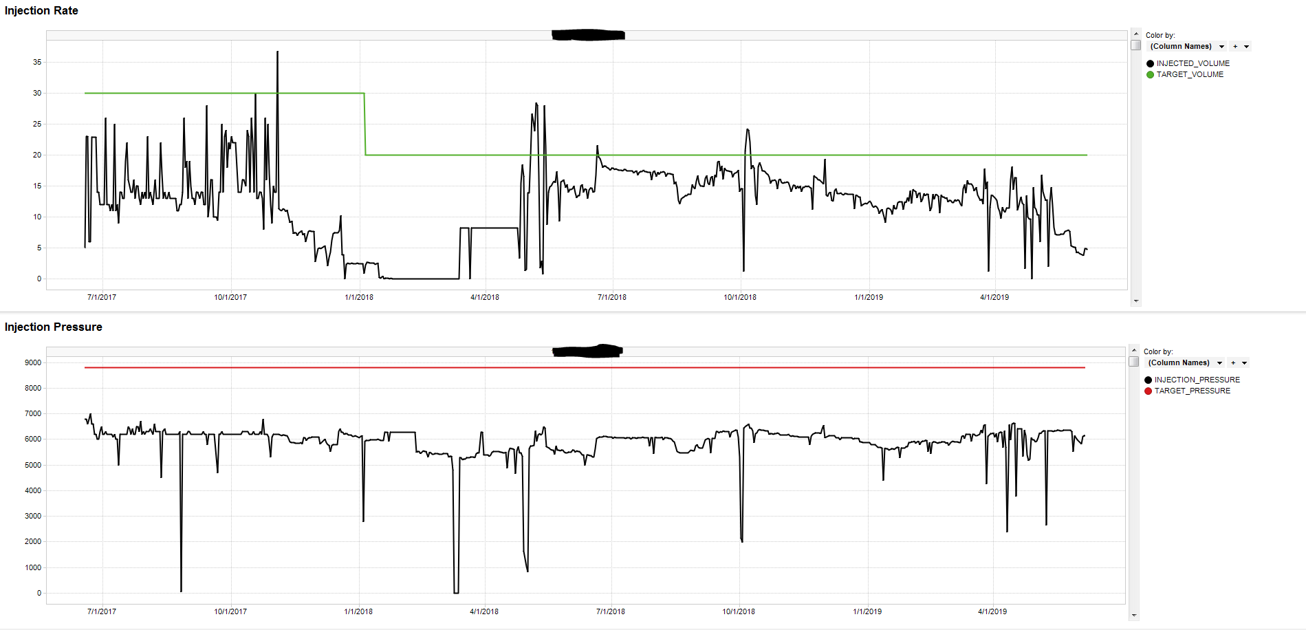 I have attached a basic example below. Let's say I have a list of injection wells. I have a daily data table that contains columns for the following for each well: daily injection rate, daily pressure, target injection rate, and maximum allowable injection pressure. I would like to create a line chart showing this daily data with trellis pages for each well in order to monitor the injection rate versus the target and the injection pressure versus the maximum allowable pressure. Each trellis page would have two row trellises - one with the injection rate and target injection rate plotted together, the other with the injection pressure and maximum allowable injection pressure plotted together. Currently I have to do this as two separate visualizations, as shown in the attachment, since I do not believe there is a way to do this as a single visualization using trellises. The issue with this is that the scrolling is not linked between the two visualizations, so if people aren't paying attention they may be viewing injection data from one well and pressure data from another well.