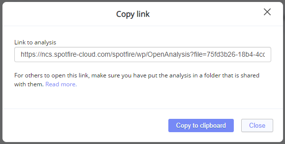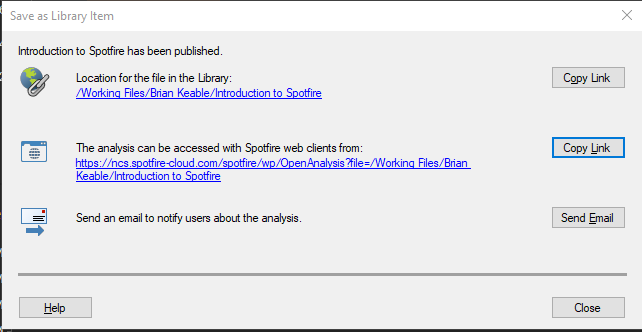 It would be helpful if, in the "Save as Library Item" dialog that pops up in the Spotfire Analyst client after saving a Spotfire file to library, it would supply the URL/link to the web player for a Spotfire file that uses the file ID in addition to the file link that contains the file path.