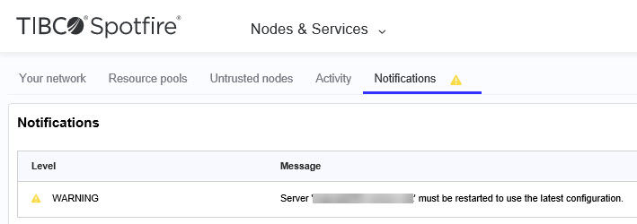 When a new Spotfire Server configuration is uploaded to the database, a WARNING message shows up under Nodes & Services -> Notifications, informing that the Server 'XXXX' must be restarted to use the latest configuration (see attached screenshot).