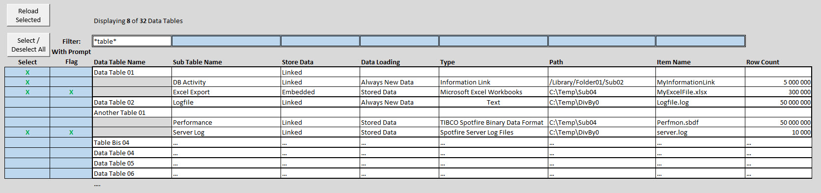 In analysis with many Data Tables, when you know that one or several Data Tables would take significant time to reload, in cases such as troubleshooting, development (complete the list), you may not want to reload specific Data Tables.