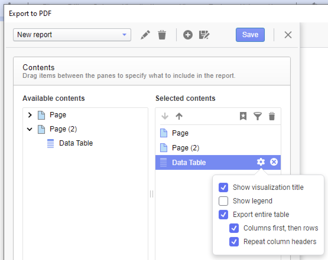 Export to PDF where one page has multiple visualizations and another page has a table that doesn't fit on one page.