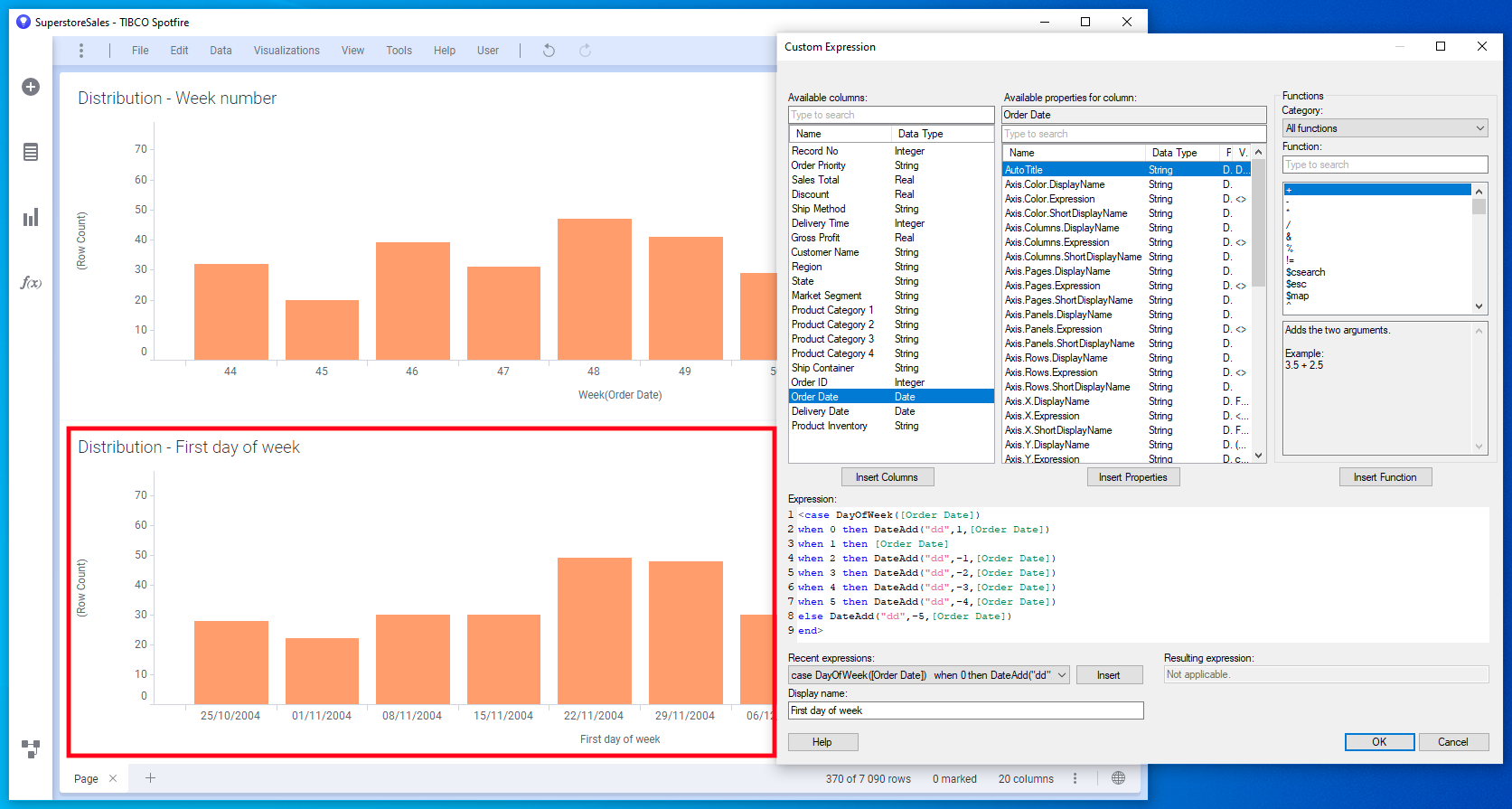 I then created a hierarchical column [Year] >> [First Day of Week] an plotted this on the x-axis but I then had the problem that the chart does not order the [First Day of Week] correctly (i.e. in date order) since it's not a date or purely numerical field.