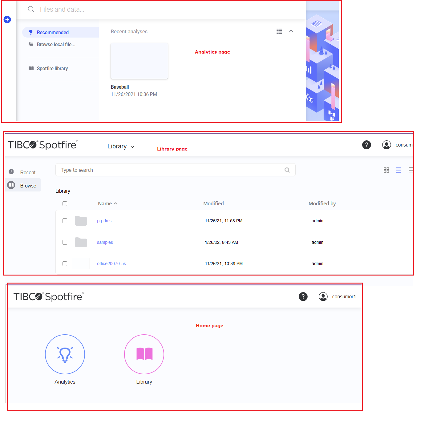Currently if log in as consumer, the first page right after login could be Analytic (with File and Data flyout shown), Library (with a list of files/folders in library shown) or home(with Analytic, Library icons shown).