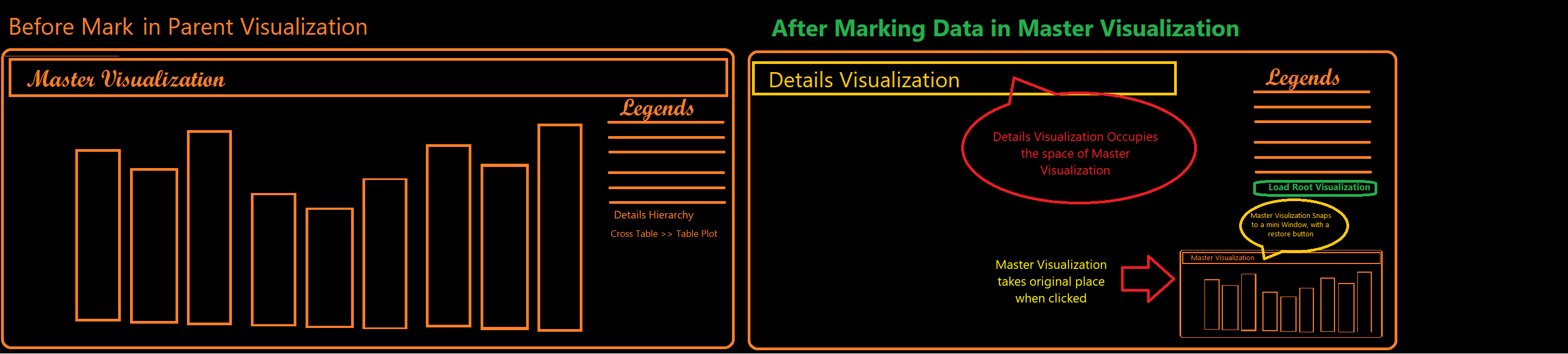 Idea is to create a reusable container as a new visualization type, which aggregates the Master Visualization and Hierarchy/Series of Details Visualization in one space. As soon as someone marks data in Parent Visualization, Dependent visualization takes space of Master and Master visualization snaps to a minimized visualization below Legends.