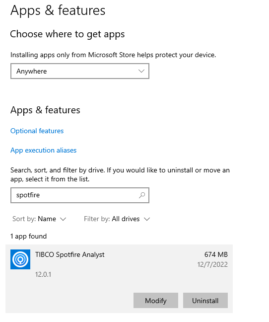 When Spotfire Analyst is installed using the installer package, Windows 10 (Add / Remove programs) does display the current version of Spotfire Analyst.