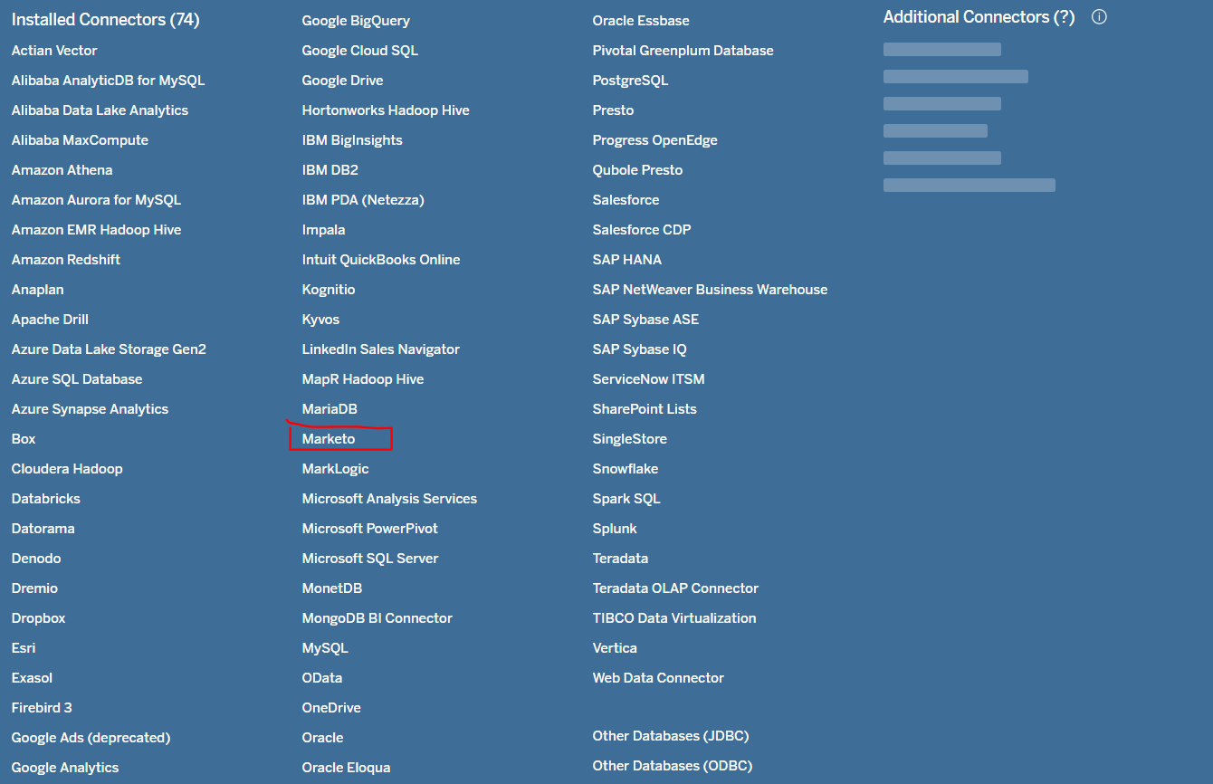 I would like to be able to connect to it without any issue but it seems difficult right now, without an OTB connector. as a result I might have to use another BI software to handle Marketo data, and therefore an entire solution for Customer analytics, given the fact that I need to combine Marketo data with other datasets.