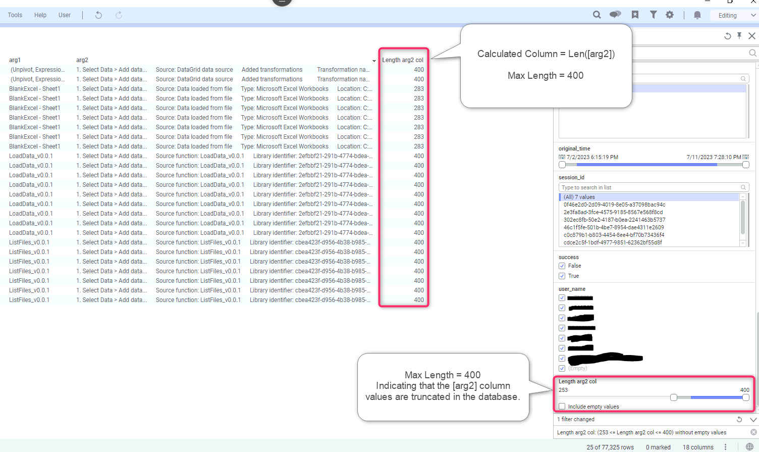 When using PostgreSQL and Oracle DB for spotfire action logs we have observed that the log entries for arg2 column are truncated at 400 characters. We tried changing the arg2 field to text datatype in the database via database creation scripts provided with spotfire installation scripts on a fresh installation. Even though the arg2 column is now text datatype, we are still seeing the entries are truncated at 400 characters. We have some custom apps logging information longer than 400 characters. Is there a way to fix the issue? If it is a product limitation, it would be great to add this enhancement in future releases.