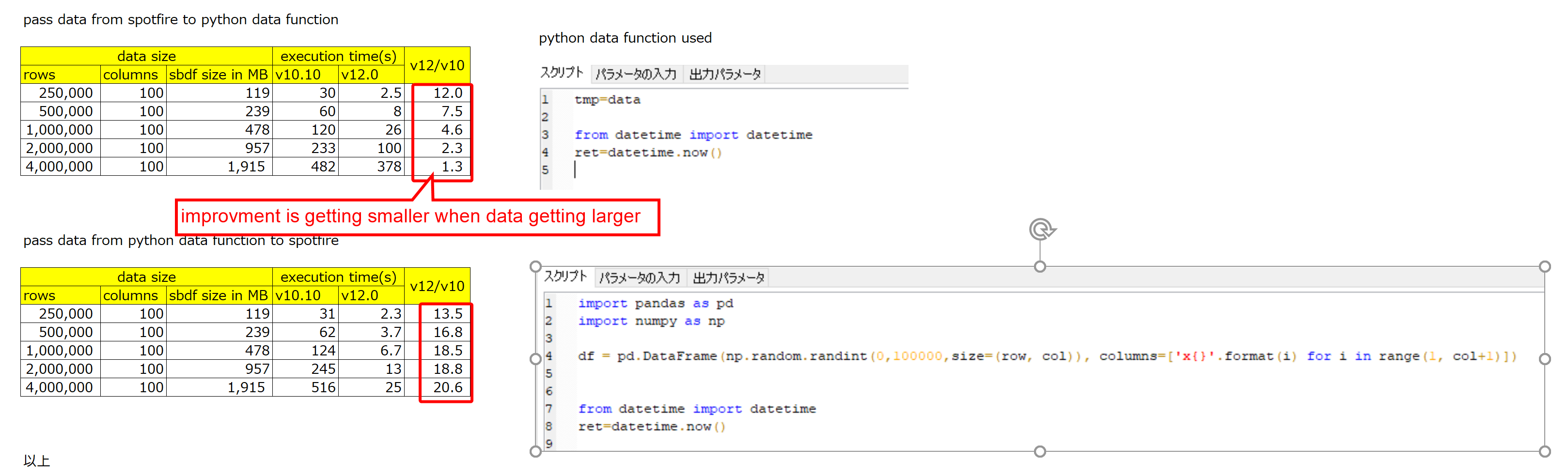 However, as far as I have tested, although spotfire.sbdf.export_data() is greatly improved and much faster than before(v10.10) when data is getting larger, spotfire.sbdf.import_data() is not faster enough, especially when data is getting larger, it may be even slower than before.