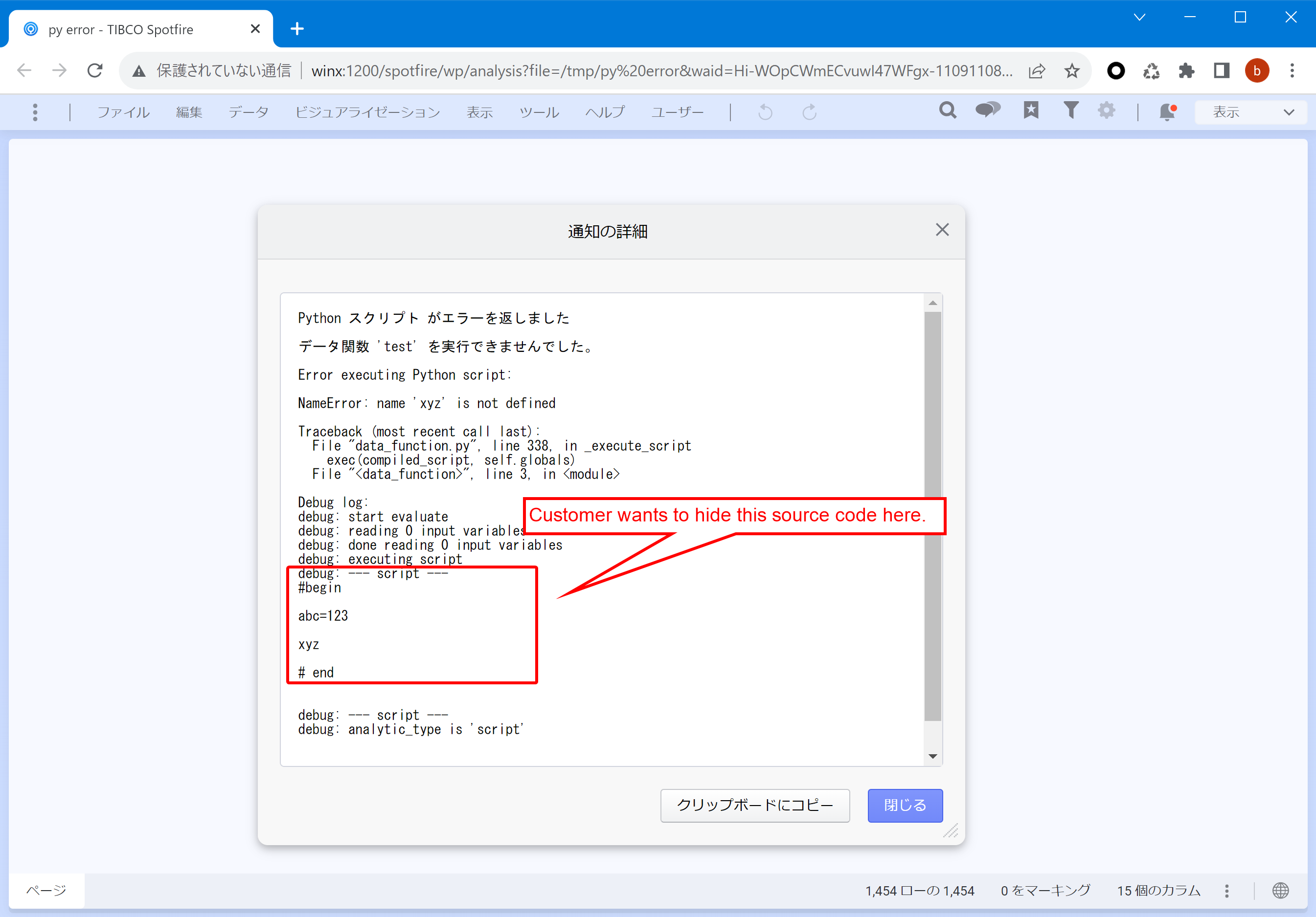 One of our customer wants to conceal the Python script source code within error notifications, in order to prevent it from being seen by end users.