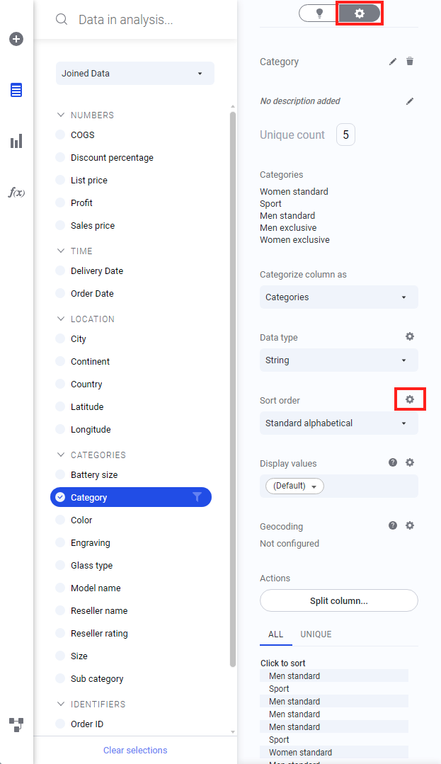 Have you tried to modify the sort order at the column level instead? You can change the sort order of a column from the data in analysis panel (see screenshot).