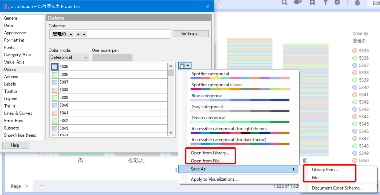 Customer want to export/import color scheme from/to combination chart, which is not available for combination chart (only), in case of bar chart or scatter plot, this can be done in 'Colors' tab of the Properties dialog.