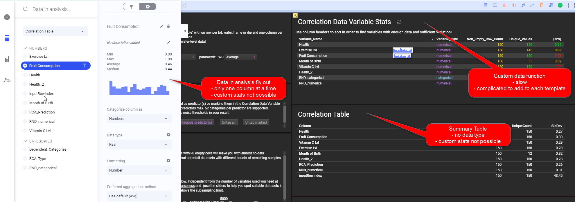 The summary table is a nice and quick tool to get an overview of all columns in a data table. However, it lacks a few features which is why we end up re-inventing the wheel with adding a data function and subsequent visualization set-up. Many of the missing features are actually provided by the data in analysis fly-out (such as data type or a small histogram) but only for a single column at a time.